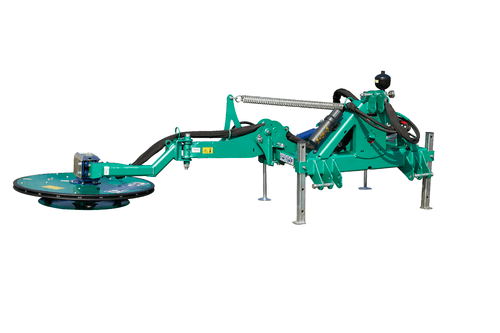 Broyage à droite : attelage 3 points arrière, 3 points avant ou chargeur. Broyage à gauche : attelage 3 points avant et télescopique. Rotor avec 3 couteaux escamotables. Couteaux 3 positions. Vitesse de rotation du rotor 1 900 tr/mn à 50 L/mn. Coupelle d'appui Ø 700 mm libre en rotation avec semelle HARDOX et inclinaison pour un meilleur suivi du sol. Effacement par vérin et boule d'azote réglable par pompe à main. Largeur de travail : 1 m. Fabriqué en France