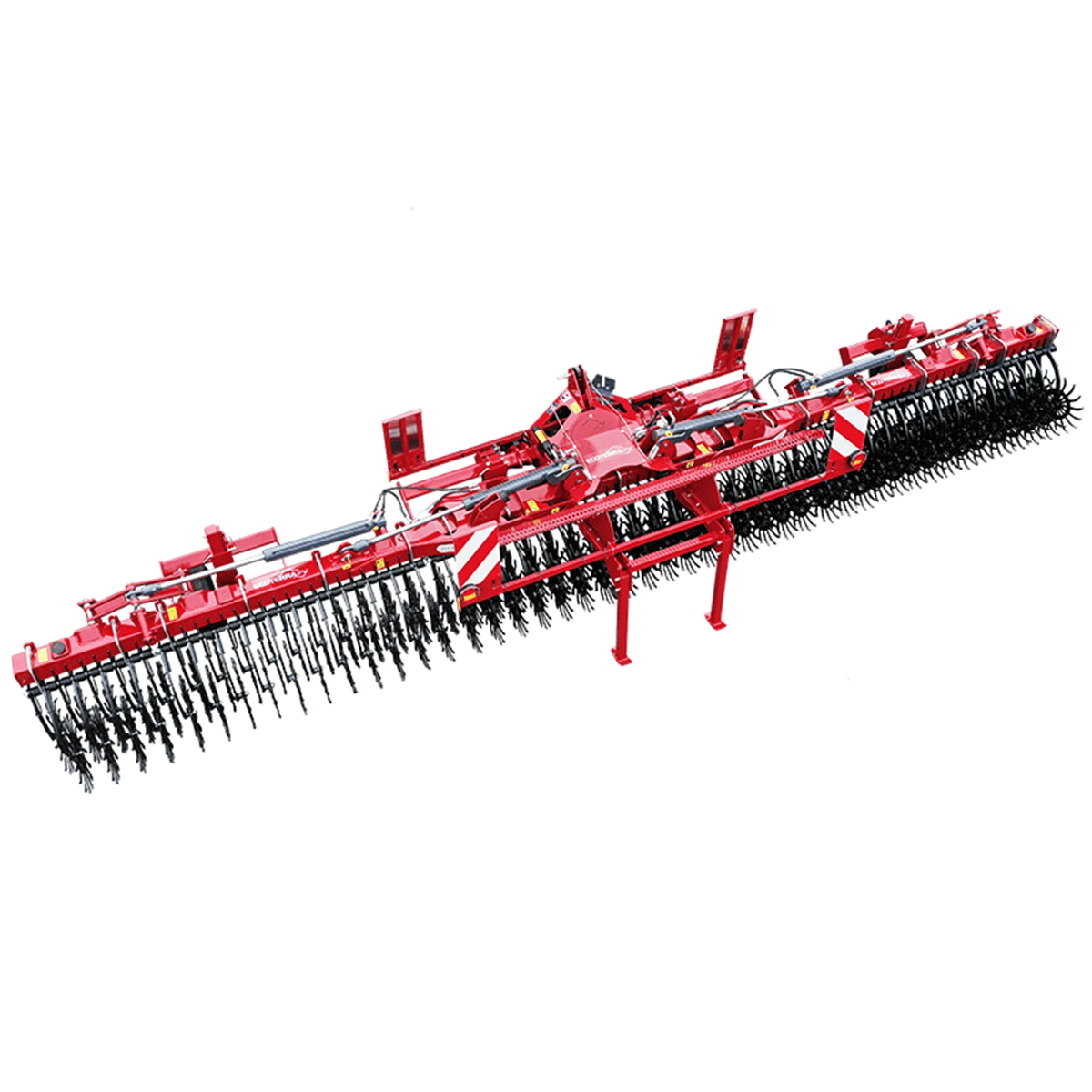 La houe rotative ROTAKING pour le désherbage mécanique, l’écroutage, l’aération du sol des cultures, fixe ou repliable avec une largeur de travail de 3 m à 12,4 m selon les modèles. Rotors Ø 540 mm décalés montés en quinconce sur 2 rangées décalées, espacement de 87 mm permet de mieux laisser passer les résidus végétaux et évite le blocage par les pierres. Réglage de la position des roues (1,5 m-2,3 m) pour s’adapter aux entre-rangs et pour la hauteur des roues grâce à une crémaillère et un indicateur. Attelage 3 points en chapes Cat.2 et 3. Nombreux équipements de série et en option pour chaque utilisation.
