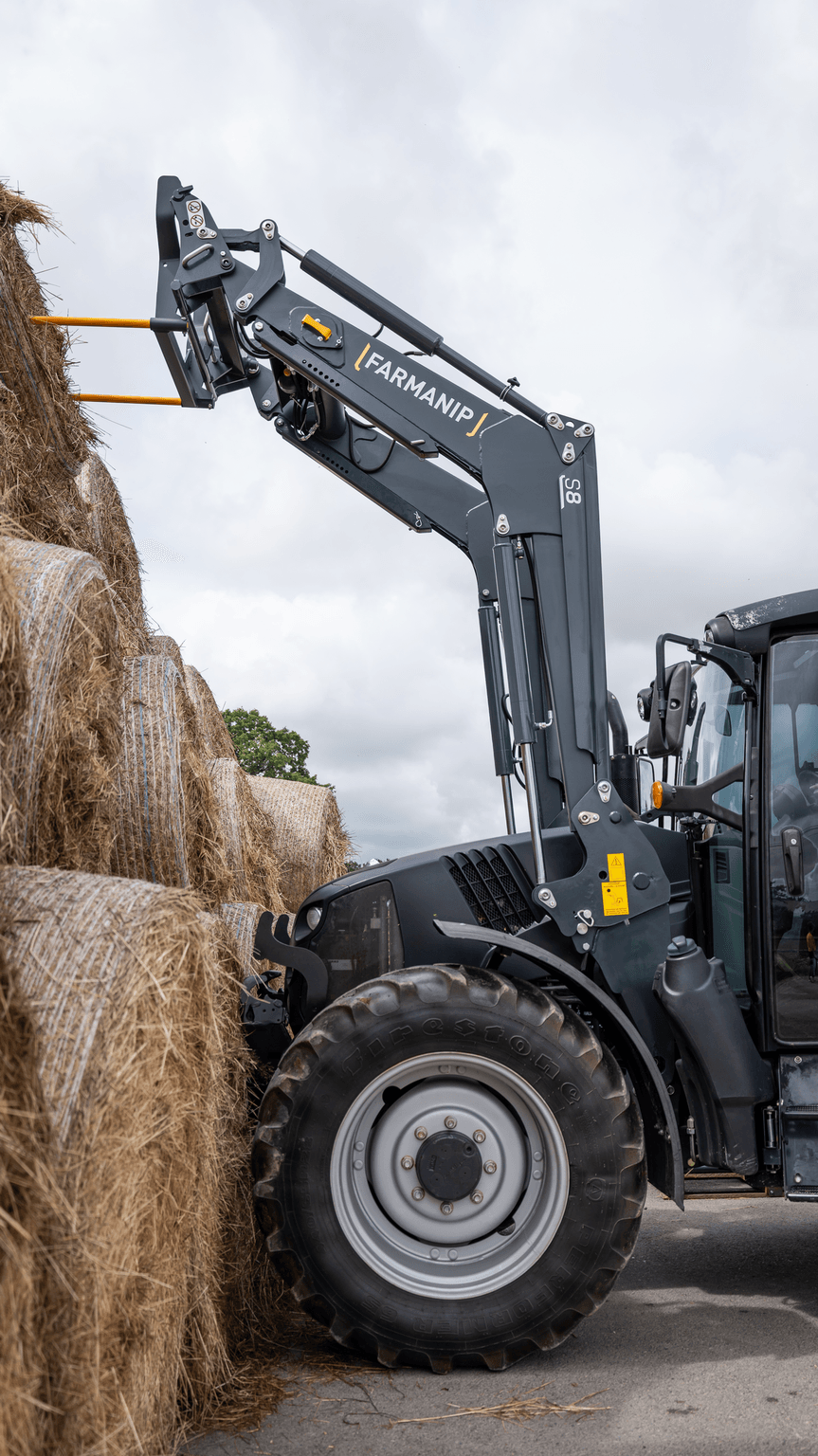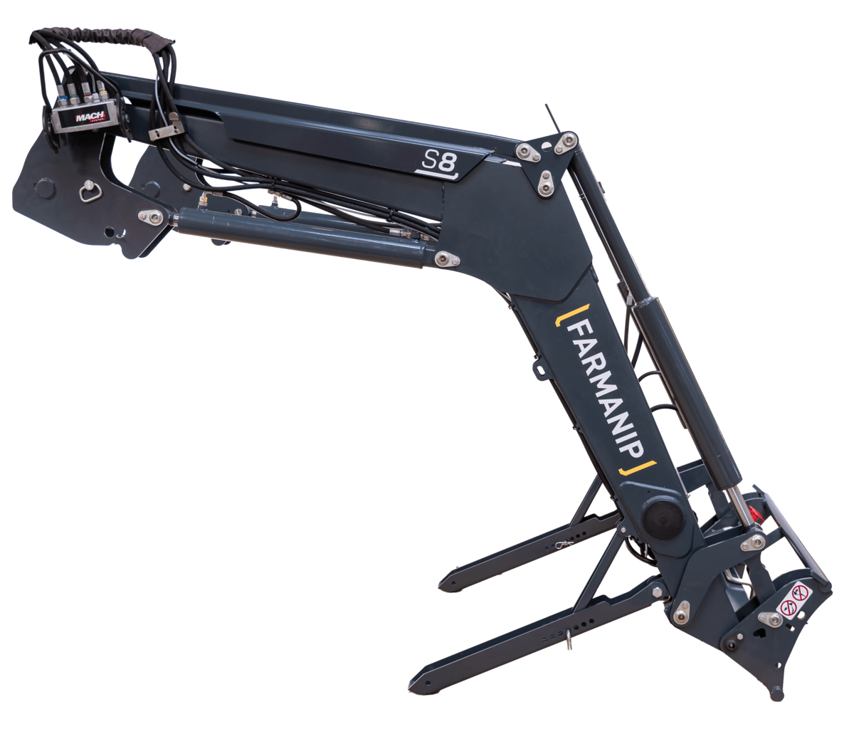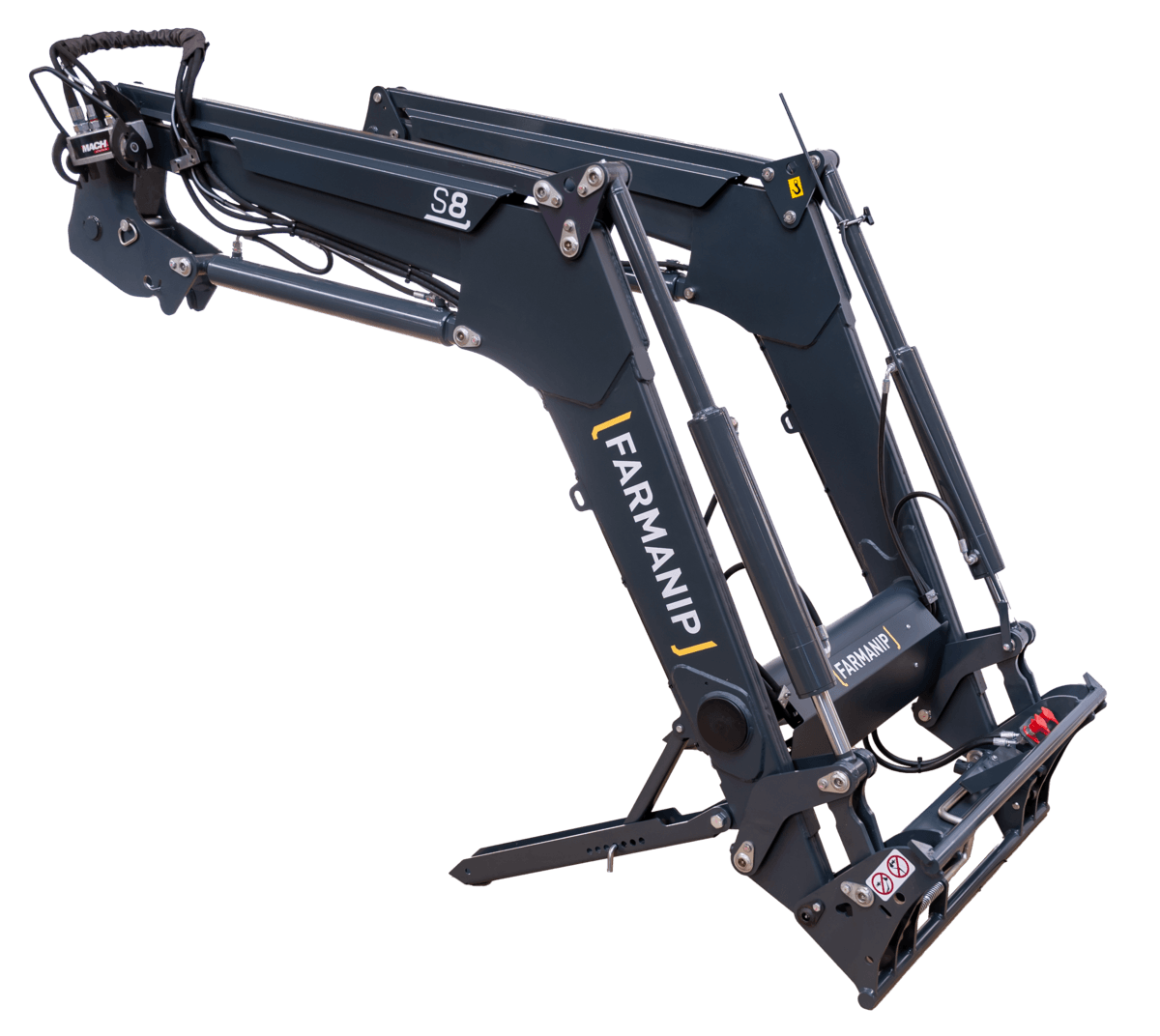 Chargeur S8. Compatible pour tracteurs de 80 à 130 cv. Hauteur de levée à l'axe de l'outil : 3,8m. Angle de cavage au sol: 49°. Angle de déversement à hauteur maxi: 55°. Charge utile à 0,80m de l'axe de rotation de l'outil (calculée avec un outil de 180 kg) : - au sol : 1650 kg. - à 2m du sol : 1700 kg. - à hauteur maxi : 1600 kg.