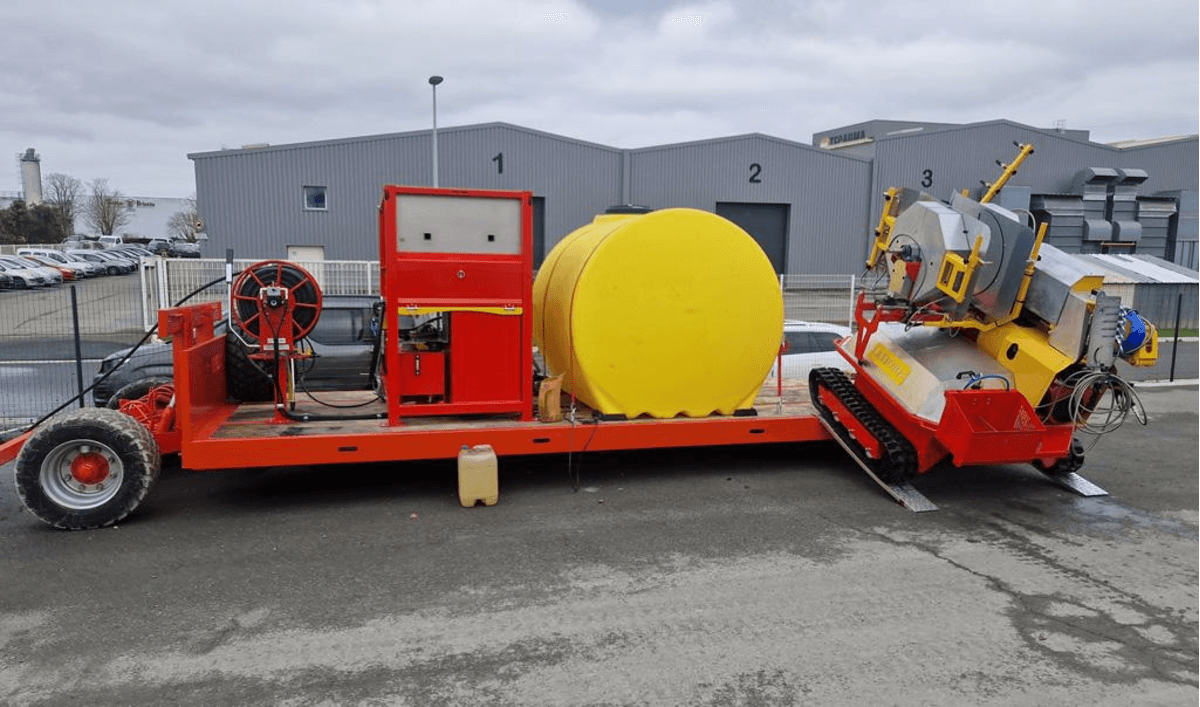 Avec un groupe haute pression posé à l’extérieur du bâtiment avec cuve tampon de 1000 litres en même temps qu’une vanne de vidange avec enrouleur de tuyau HP, longueur 100 mètres, une pompe haute pression de 140 bars et de 87 l/min de débit. Moteur thermique essence 22 ch. Rampe 1,58 m avec 6 rotabuses.