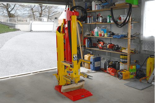Coin tranchant en acier haute résistance, 2 roues de transport. Commande bimanuelle à double vitesse avec point neutre et remontée automatique du coin.