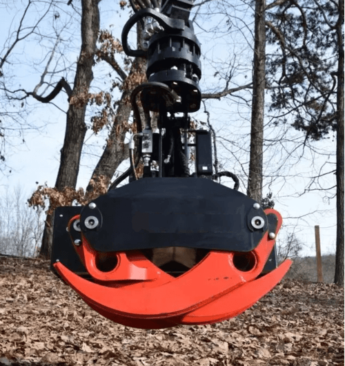 Pour les applications plus complexes, nous proposons le grappin coupeur abatteur pendulaire avec TILT, offrant un diamètre de coupe maximal de 500 mm et une force de 1275 daN, spécialement conçu pour les pelles ou grues, permettant une flexibilité et une polyvalence accrues sur le terrain.