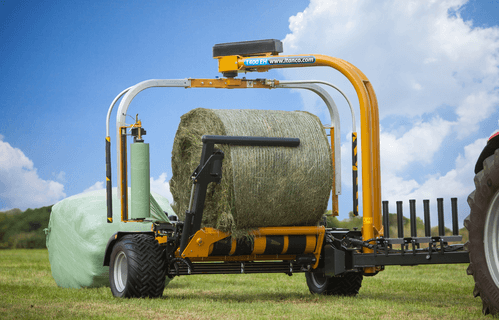 Enrubanneuse traînée double satellites, chargement dans le sens d'avancement de la presse. Table d'enrubannage fractionnée permettant un chargement et un déchargement simultanés de la balle. Ø de balle jusqu'à 1,5m et poids maxi 1 400kg.