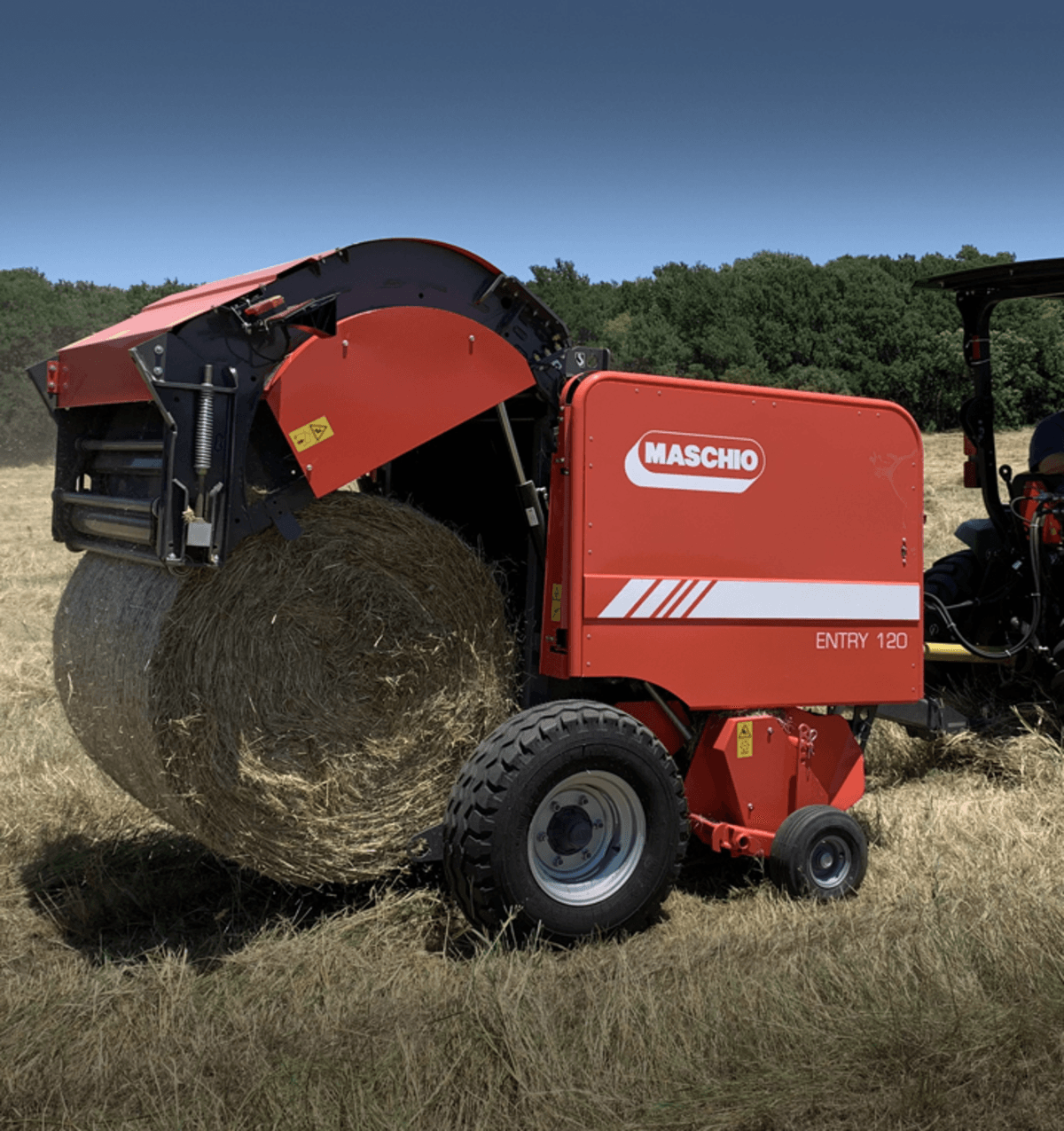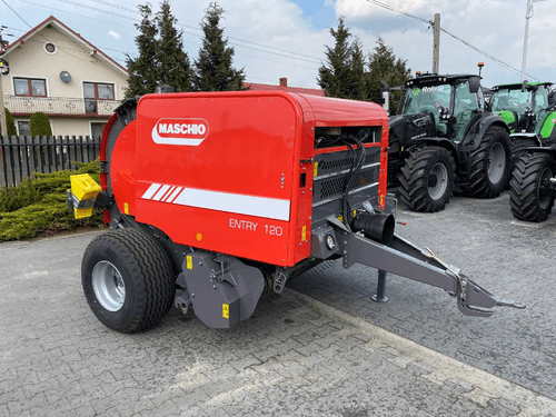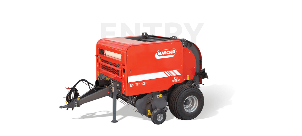 Presse à chambre fixe chaînes barrettes. Ø 1,20 m. Ameneur alternatif. Pick up largeur 2 m. Lubrification automatique des chaînes. Serrage hydraulique de la balle. Boîtier de contrôle électrique. Liage filet. Roues 400/60-15,5. Cardan homocinétique.