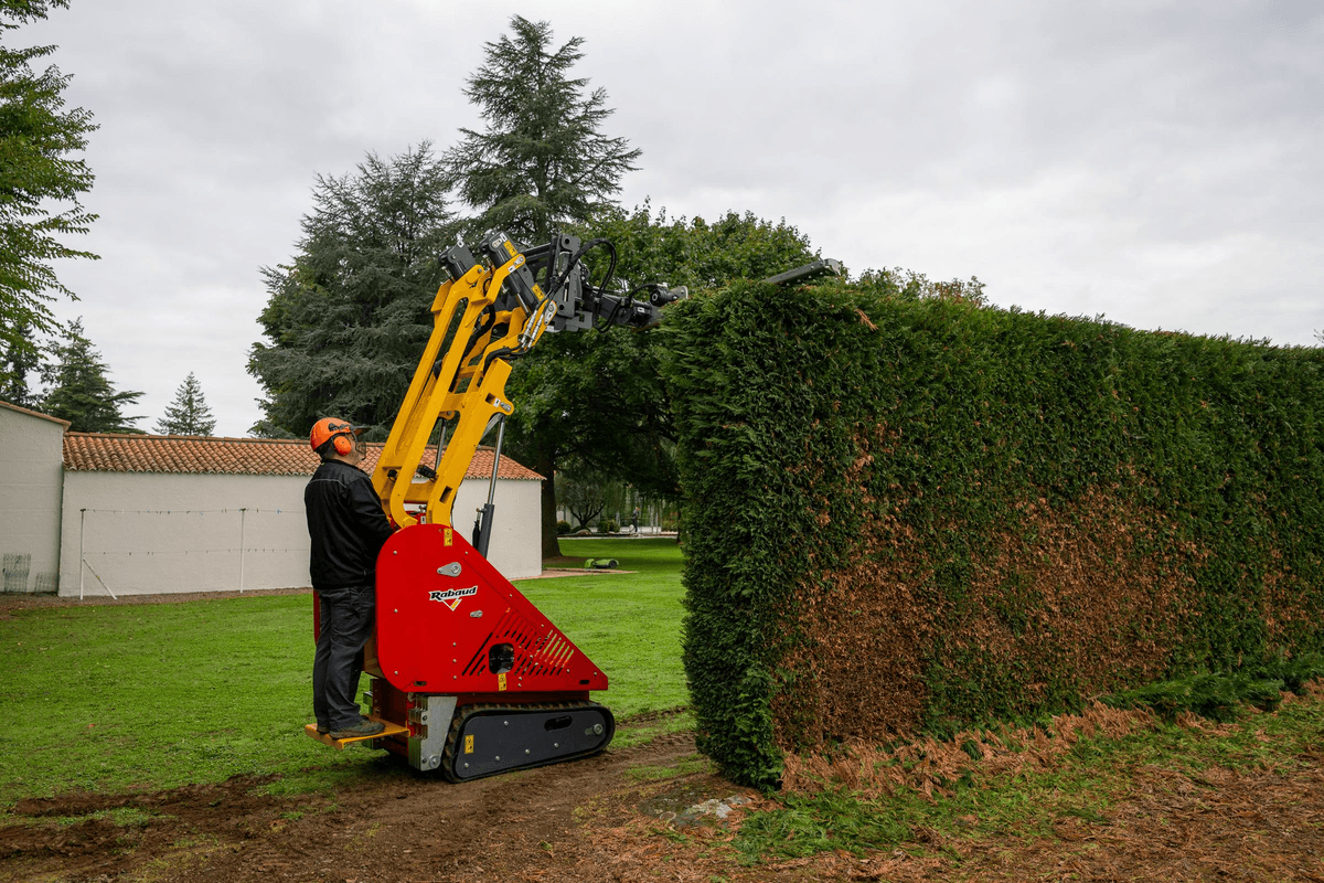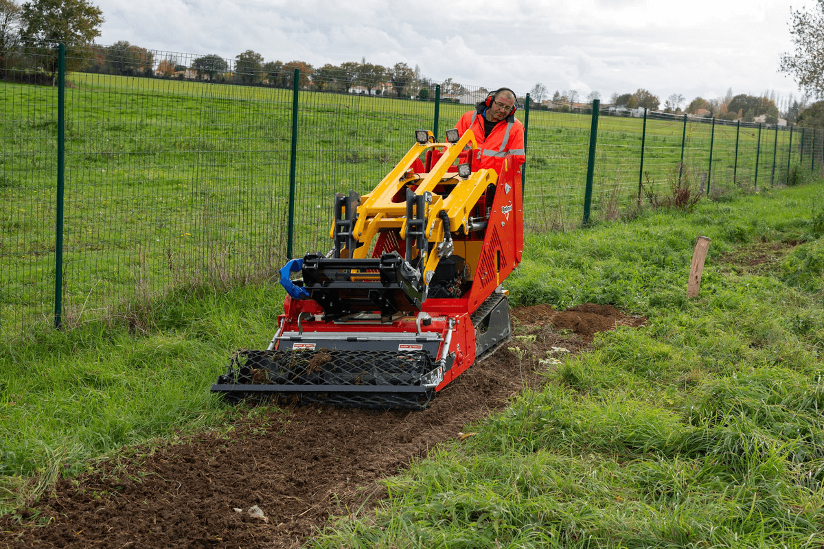 2 lignes double effet (13 l/min) + 1 ligne double effet (40 l/min) sur pompe dédiée, garantissant la puissance hydraulique de l’outils sans perte de vitesse d’avancement. Vitesse de déplacement jusqu’à 4 km/h. Commandes directionnelles type mini-pelle. Capacité de franchissement de 25°