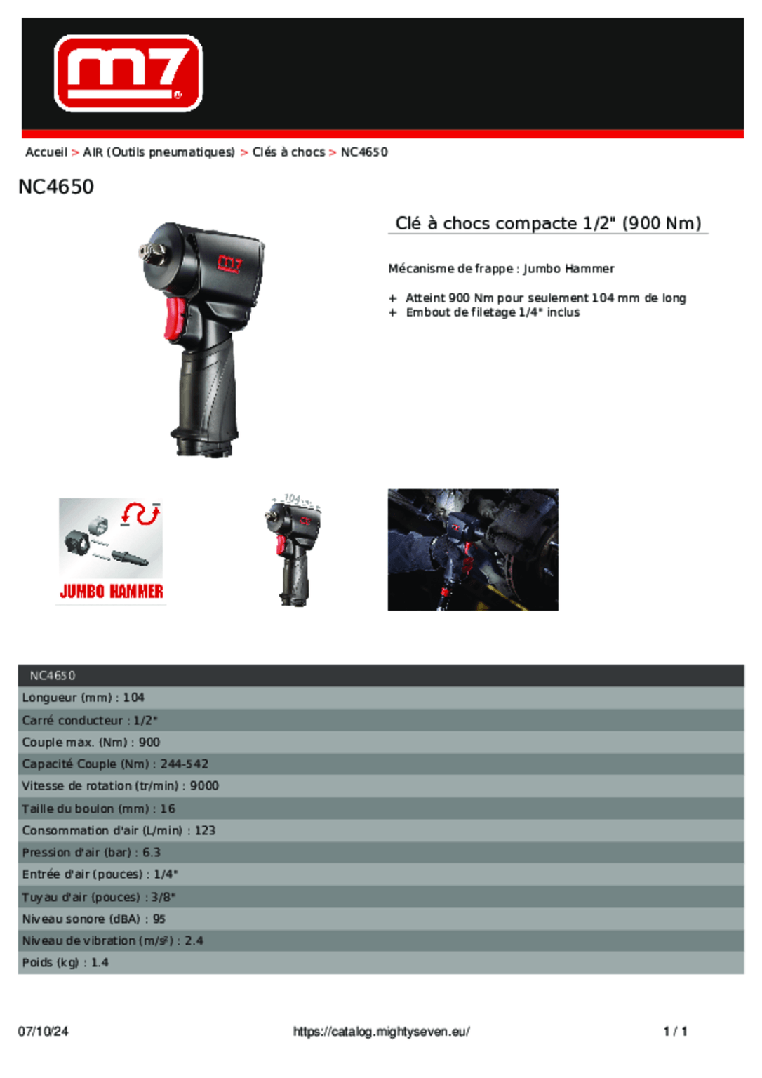 Clé à chocs pneumatique compacte. Carré conducteur : 1/2''. Taille du boulon : 16 mm. Capacité couple : 244-542 Nm. Couple maximal : 900 Nm. Vitesse de rotation : 9000 tr/min. Consommation d'air : 123 L/min. Pression d'air : 6,3 Bar. Longueur : 104 mm. Poids net : 1,4 kg. Entrée d'air : 1/4''. Tuyau d'air : 3/8''. Niveau sonore : 95 dB. Niveau de vibration : 2,4 m/s². Poignée en caoutchouc design, anti-glisse et anti-vibrations. Sans risque pour l'audition. Carton imprimé.