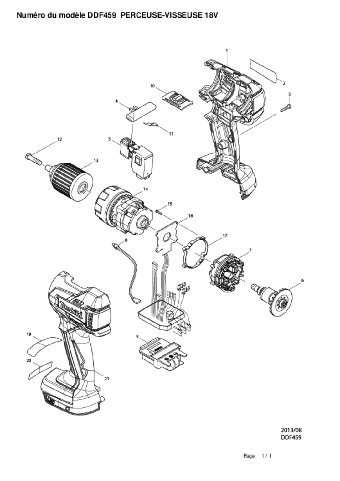 Modèle DDF459RMJ. Nombre de vitesse : 2. Régime à vide : 0 à 400 tr/min, 0 à 1500 tr/min. Couple de serrage maxi : 25 Nm. Couple de serrage maxi (franc) : 45 Nm. Couple réglable sur 16 positions + position perçage. Capacité : acier : 13 mm, bois : 38 mm. Capacité du mandrin : 1,5-13 mm. Poignée à revêtement Soft Grip pour plus de confort. Livrée avec : coffret MAK-PAC. Chargeur, batterie Lithium 18V/4 Ah, crochet ceinture.