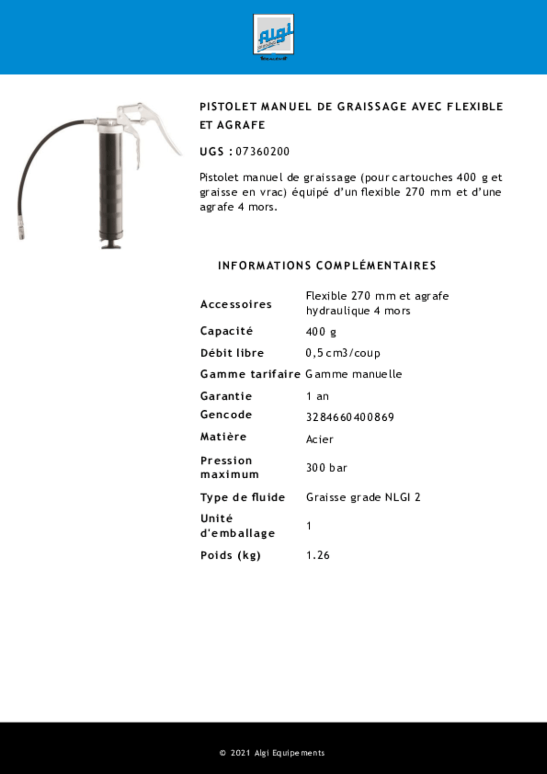 Pression de service : 200 Bar. Flexible polyamide 300 ml. Agrafe 4 mors.