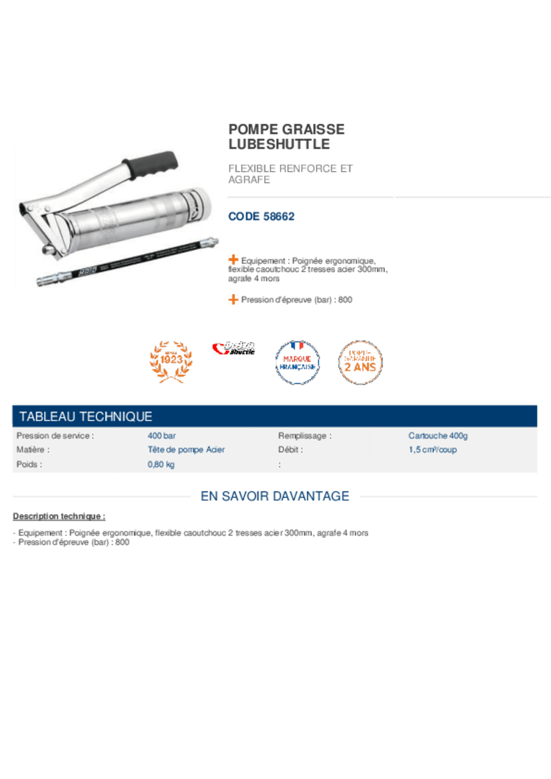 Tête en acier galvanisé. Poignée ergonomique, emballage carton écologique. Pression de service 400 Bar, haute pression jusquà 800 Bar. Flexible caoutchouc 2 tresses acier 300 mm, agrafe 4 mors. Pour cartouche à visser.