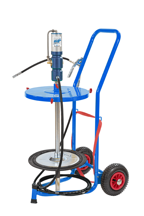 Surpresseur mobile. Livré complet avec pompe pneumatique 60/1, couverture de diamètre 395 mm, diable et plateau suiveur Ø370 mm, flexible 4 m, pistolet à graisse, chariot 2 roues. Chariot avec 2 roues gonflables avec anse 2 bras.