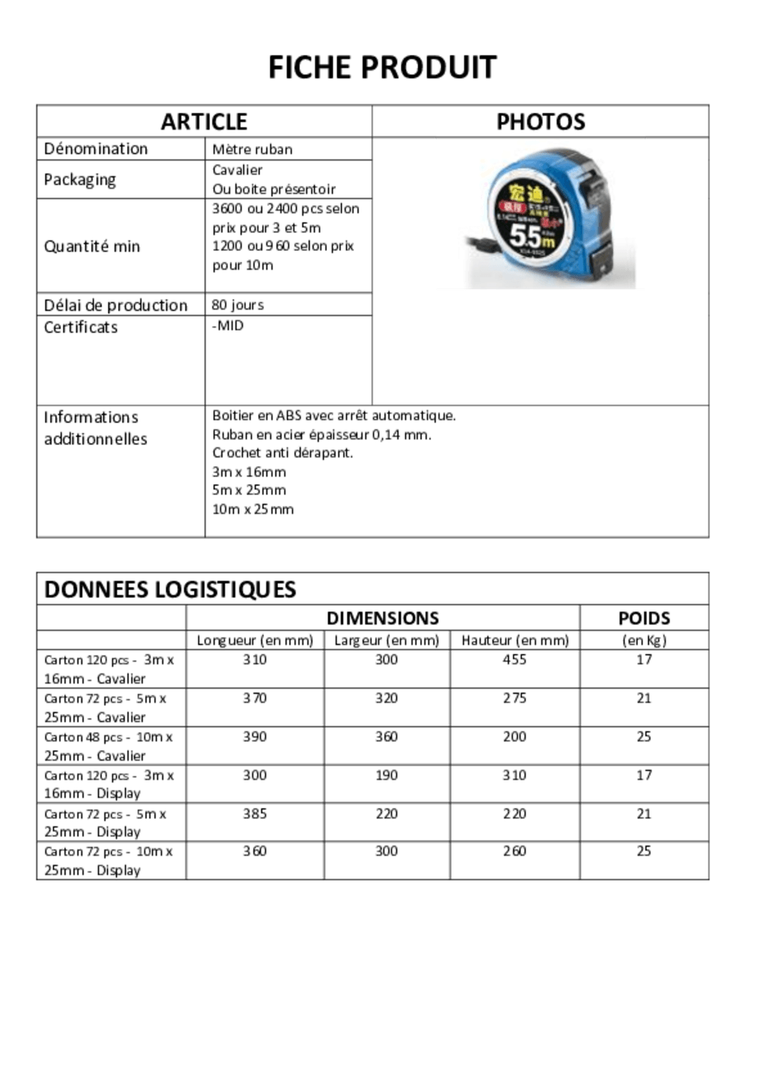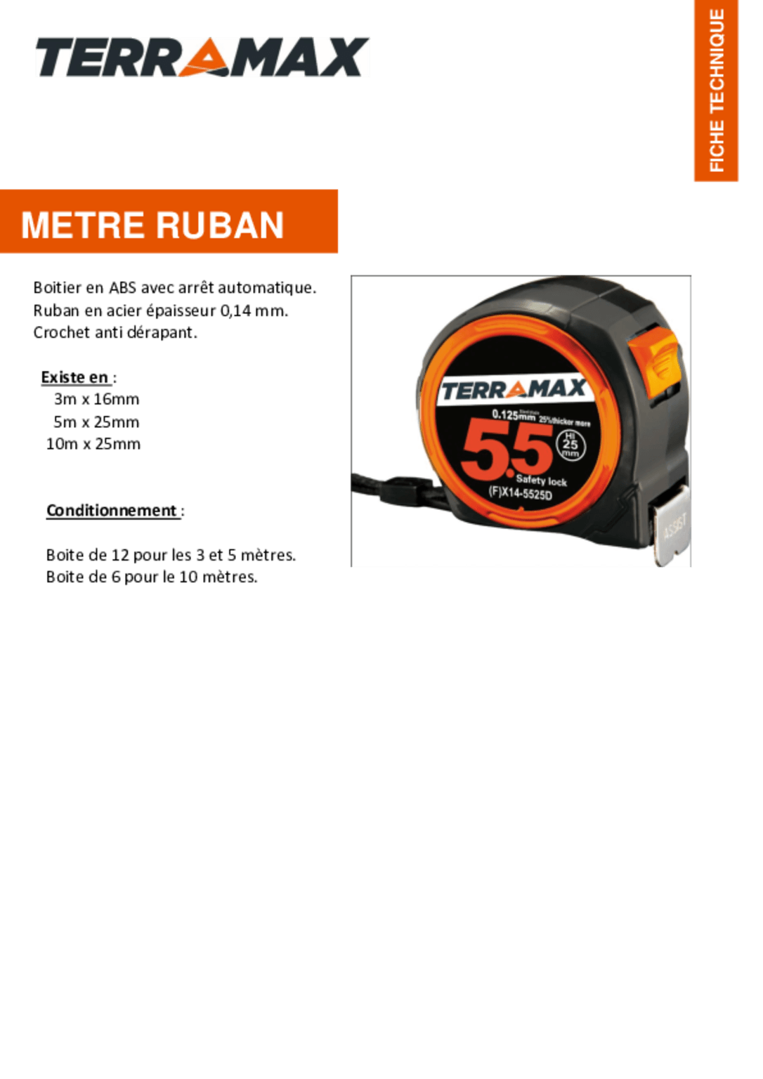 Mètre ruban 25 mm. Longueur : 5 mètres. Boitier compact. Arrêt automatique, crochet antidérapant.