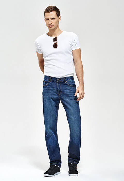 Couleur SW brossé : marine brossé, coutures tabac. Tailles du 38 au 48. 100 % coton. 5 poches, coupe droite, taille normale, zip, bords usés.