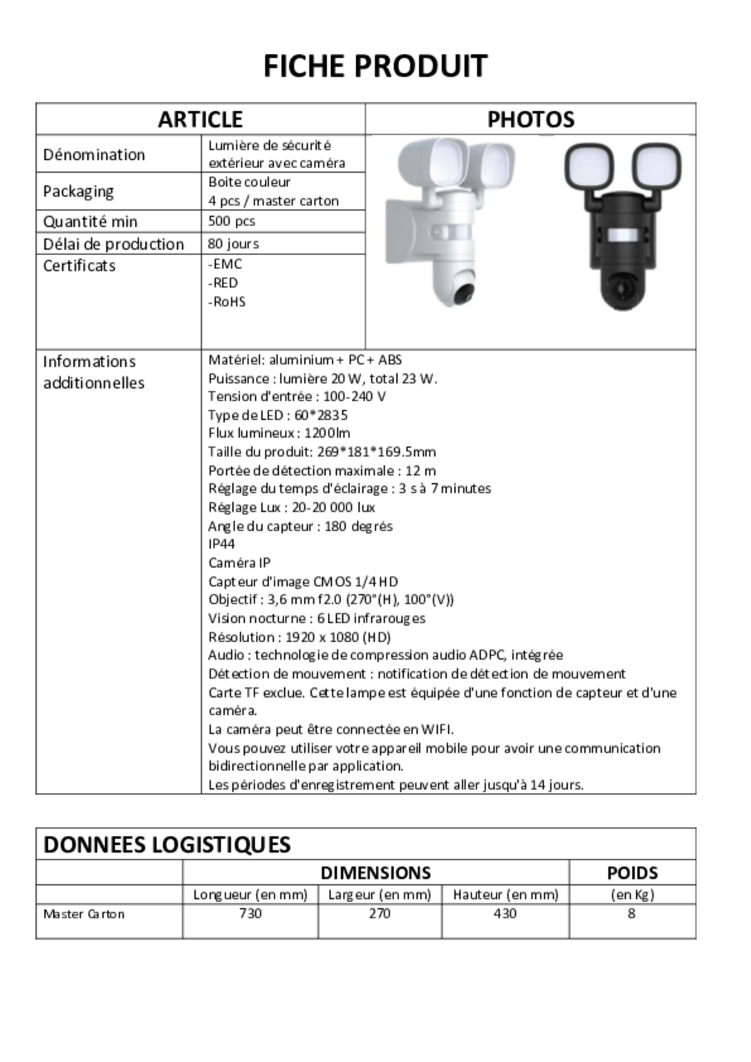 Caméra de surveillance avec éclairage extérieur. Vision nocturne?6 LED IR. Résolution : 1920x1080(HD). Objectif : 3.6mm f2.0 ( 270°(H), 100°(V) ). Audio : Technologie de compression audio ADPC. Microphone et haut-parleur intégrés pour l'interphonie bidirectionnelle. La caméra peut être connectée au WIFI. Eclairage extérieur : Puissance : Lumière 20W, Total 23W. Tension d'entrée : 100-240V. Type de LED : 60*2835. Flux lumineux : 1200lm. Portée de détection maximale : 12m. Réglage de la durée d'éclairage : 3s-7mins. Réglage de la luminosité : 20-20000 lux. Ange du capteur : 180 degrés. IP44. Taille du produit : 269*181*169.5mm.