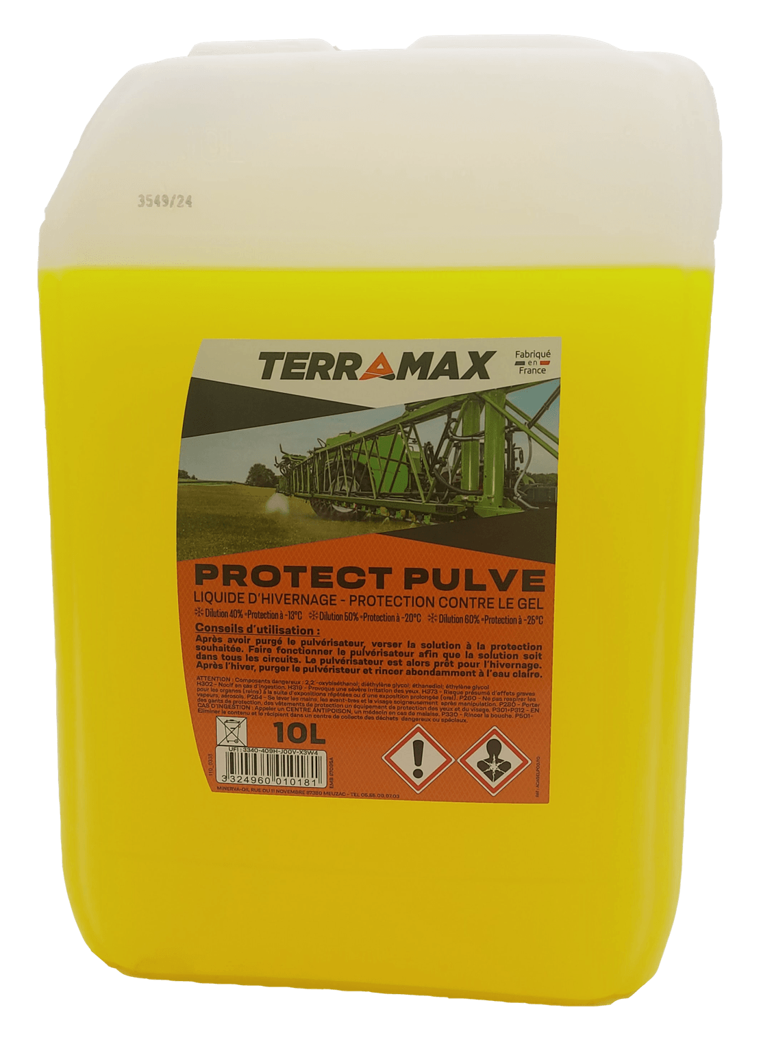 Protection et hivernage de pulvérisateur avec action nettoyante. Protection anti-corrosion. Protection des membranes. Nettoyage contre l'obturation. Pour une protection à -13 °C : 40 % protect pulvé + 60 % eau. Pour une protection à -25 °C : 60 % protect pulvé + 40 % eau. Pour une protection à -20 °C : 50 % protect pulvé + 50 % eau. Jerrican 10 L.